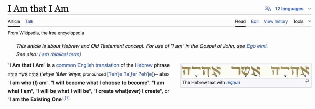 אֶהְיֶה אֲשֶׁר אֶהְיֶה (’ehye ’ăšer ’ehye) is the first of three responses given to Moses when he asks for God‘s name in the Book of Exodus.[2] The word אֶהְיֶה (’Ehyeh) is the first person singular imperfective form of הָיָה (hayah), ‘to be’, and owing to the peculiarities of Hebrew grammar means ‘I am’ and ‘I will be’.[3] The meaning of the longer phrase ’ehyeh ’ăšer ’ehyeh is debated, and might be seen as a promise (‘I will be with you’) or as statement of incomparability (‘I am without equal’).[4]