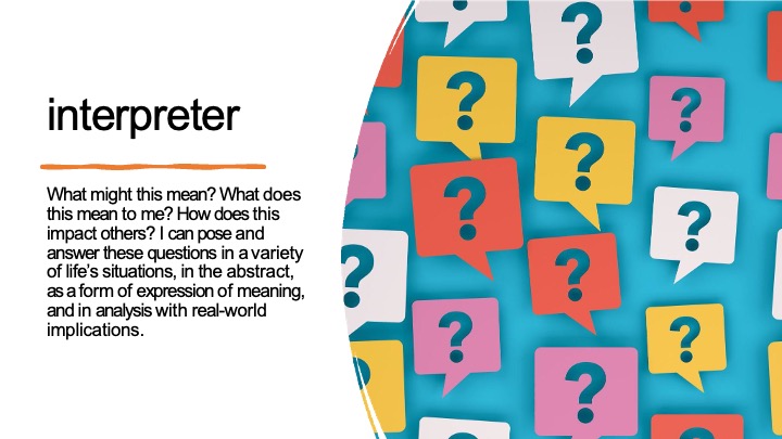 Animated by curiosity and a quest for understanding, interpreters can ask “What could this mean? What does this mean to me? How does this impact others?” They can pose and answer questions about meaning and impact in a variety of life’s situations, using a range of lenses, tools, hermeneutics, symbols, and forms of expression.