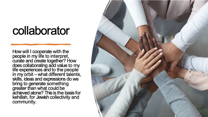 Collaborators are open to cooperating with others to interpret, curate, and create together. Collaboration is not only a meeting of the minds, but it draws together complementary talents, perspectives, and skills. Sometimes the role of the collaborator is to midwife creative products for their partners who might need a muse or feel stuck. Collaborating involves a set of subskills: They are strategic and generous in collaborating in ways that add value to their own lives and to the people in their orbit. With self-awareness, they can recognize the different talents, skills, ideas, and expressions they bring to generate something greater than what could be achieved alone. They can listen. They ask, “How can I contribute?” They can provide constructive critique that elicits rather than inhibiting the creator’s creativity. They can create and refine genius ideas in relationship with others.39